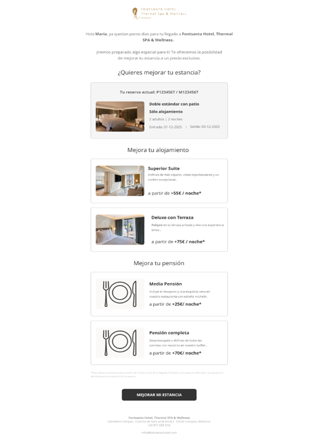 2. Cuando se cumplen estas condiciones, y siempre que naturalmente haya disponibilidad de esas habitaciones, el sistema envía un email automático al cliente con las opciones de mejora disponibles de tipo de alojamiento y de pensión.